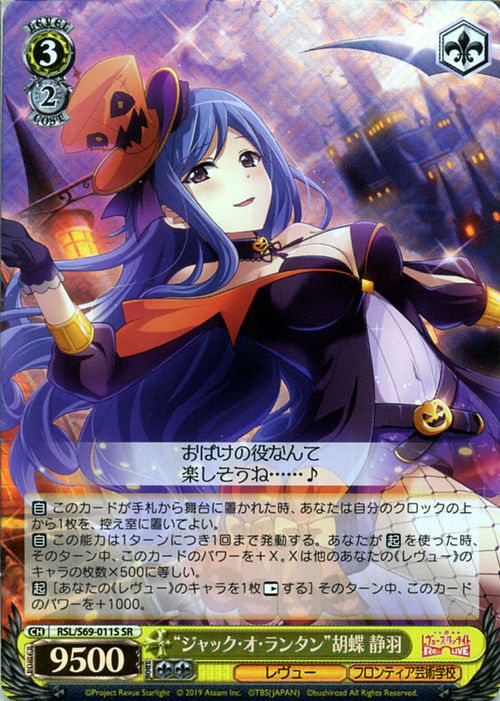 歌劇 レヴュースタァライト-Re LIVE-」(RSLS69)収録 ●RSL/S69-011S ●カード名:“ジャック・オ・ランタン”胡蝶 静羽 ●カテゴリー:キャラクター ●色:黄 ●レベル:3 コスト:2 トリガー:1 ●パワー:9500 ソウル:2 ●特徴:《レヴュー》・《フロンティア芸術学校》 ●テキスト 【自】 このカードが手札から舞台に置かれた時、あなたは自分のクロックの上から1枚を、控え室に置いてよい。