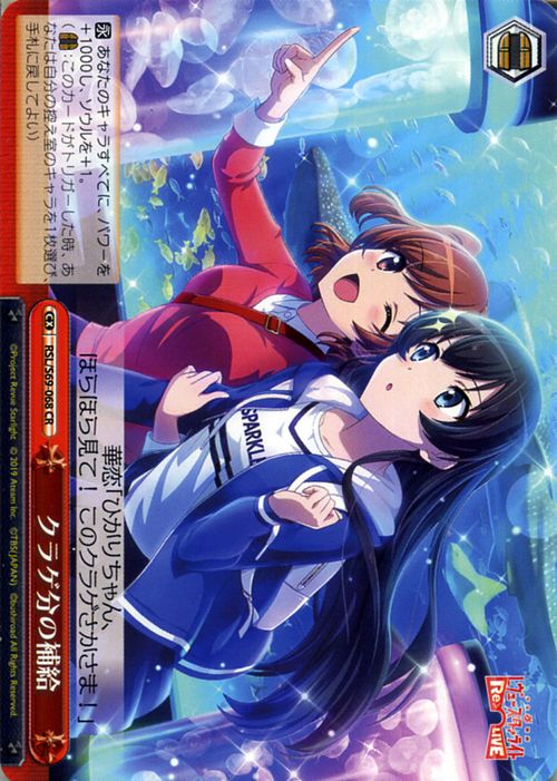 歌劇 レヴュースタァライト-Re LIVE-」(RSLS69)収録 ●RSL/S69-068 ●カード名: クラゲ分の補給 ●カテゴリー:クライマックス ●色:赤 ●レベル:0 コスト:0 トリガー:【扉】 ●テキスト 【永】 あなたのキャラすべてに、パワーを+1000し、ソウルを+1。