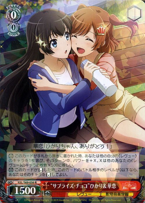 歌劇 レヴュースタァライト-Re LIVE-」(RSLS69)収録 ●RSL/S69-056 ●カード名:“サプライズ・チョコ”ひかり&華恋 ●カテゴリー:キャラクター ●色:赤 ●レベル:0 コスト:0 トリガー:0 ●パワー:1500 ソウル:1 ●特徴:《レヴュー》・《聖翔音楽学園》 ●テキスト 【自】 このカードが手札から舞台に置かれた時、あなたは他の自分の《レヴュー》のキャラを1枚選び、そのターン中、パワーを+X。