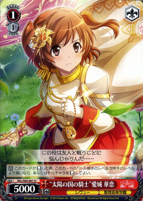 歌劇 レヴュースタァライト-Re LIVE-」(RSLS69)収録 ●RSL/S69-061 ●カード名:“太陽の国の騎士”愛城 華恋 ●カテゴリー:キャラクター ●色:赤 ●レベル:1 コスト:1 トリガー:1 ●パワー:5000 ソウル:1 ●特徴:《レヴュー》・《聖翔音楽学園》 ●テキスト 【自】 このカードが【リバース】した時、このカードのバトル相手のレベルが相手のレベルより高いなら、あなたはそのキャラを【リバース】してよい。