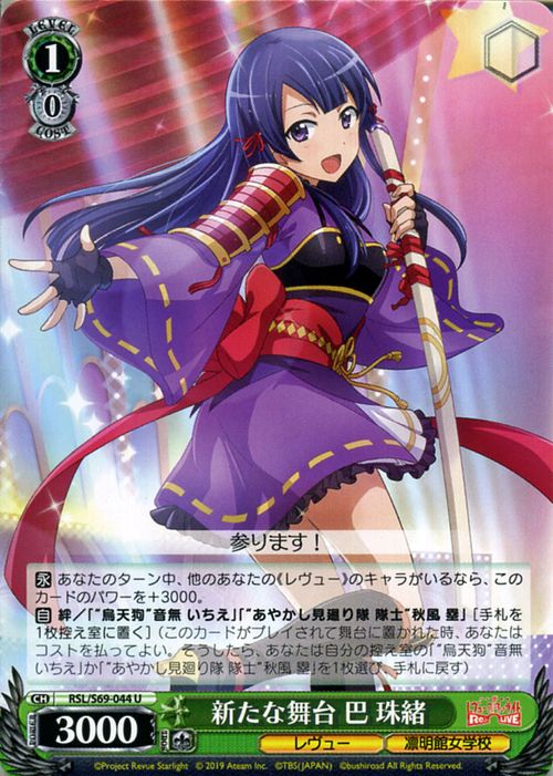 歌劇 レヴュースタァライト-Re LIVE-」(RSLS69)収録 ●RSL/S69-044 ●カード名:新たな舞台 巴 珠緒 ●カテゴリー:キャラクター ●色:緑 ●レベル:1 コスト:0 トリガー:0 ●パワー:3000 ソウル:1 ●特徴:《レヴュー》・《凛明館女学校》 ●テキスト 【永】 あなたのターン中、他のあなたの《レヴュー》のキャラがいるなら、このカードのパワーを+3000。