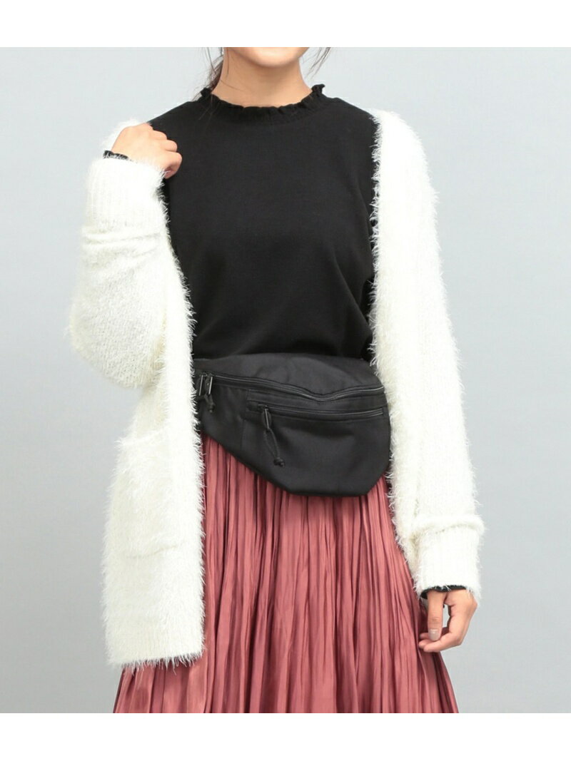 ヘアリーなフェザースラブニットを使用したカーディガン。