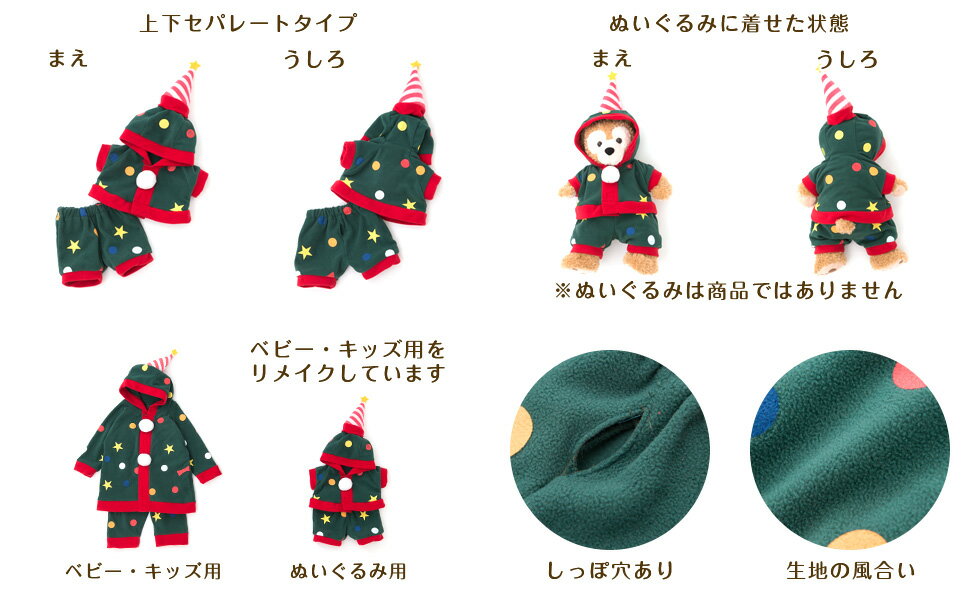 【ぬいぐるみ衣装/ハッピーツリー キッズ】 ぬいぐるみ専用 帽子付き*****ぬいぐるみは商品に含まれません*****素材本体:フリース素材 ポリエステル100%サイズ:画像のモデルのぬいぐるみはダッフィー&シェリーメイ(Sサイズ)です。